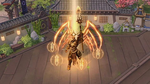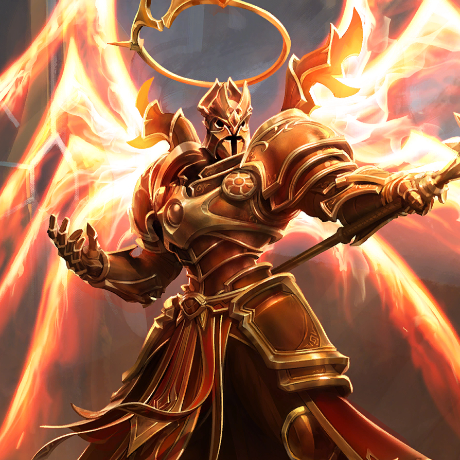 | 10 | Armamentos angelicales (R) Invoca un anillo de espadas flameantes que otorgan 1000 de escudo durante 3 segundos. Si el escudo alcanza su duración máxima, esta habilidad puede reactivarse en un lapso de 5 segundos para lanzar 6 espadas hacia un área. Cada una inflige 140 de daño al primer enemigo que golpea. |