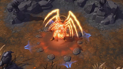 Llama calcinante (W) Incrementa el daño del área central de Fuego de Solarion un 125% más y su efecto de ralentización en un 15%. El primer héroe enemigo golpeado con Fuego de Solarion restituye 30 de maná. |