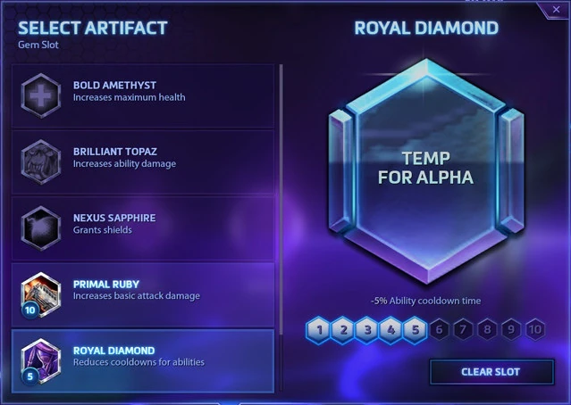 Players could choose from a wide variety of Artifacts, but only one could be fitted into each Slot, of the type matching that Slot. Artifacts had to be purchased for 100 gold before they could be used. Once purchased, Artifacts could be upgraded, up to a maximum of Artifact Level 10, each time costing a larger amount of gold. Players could select which Artifacts to use prior to each match, but could not change them within matches.
