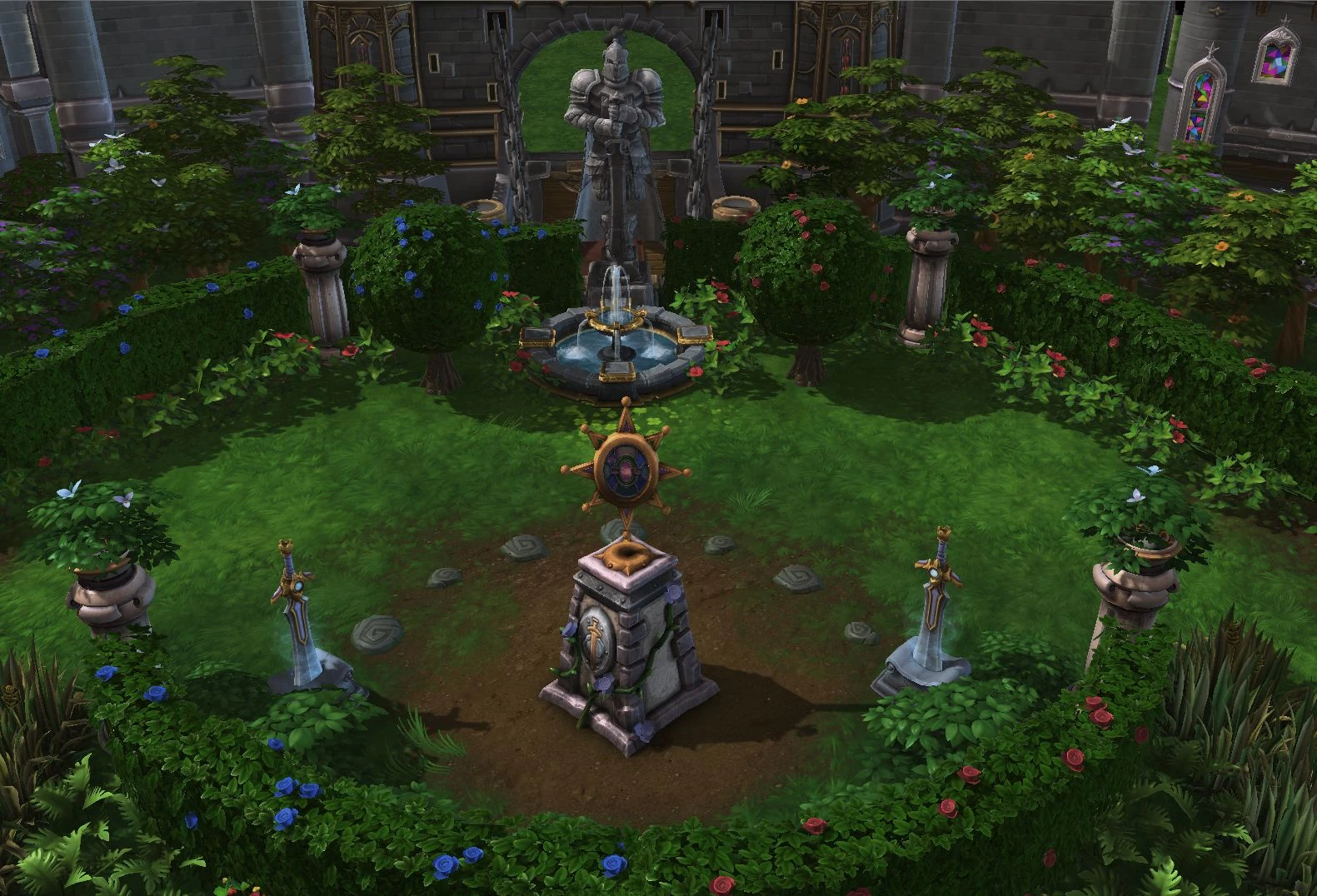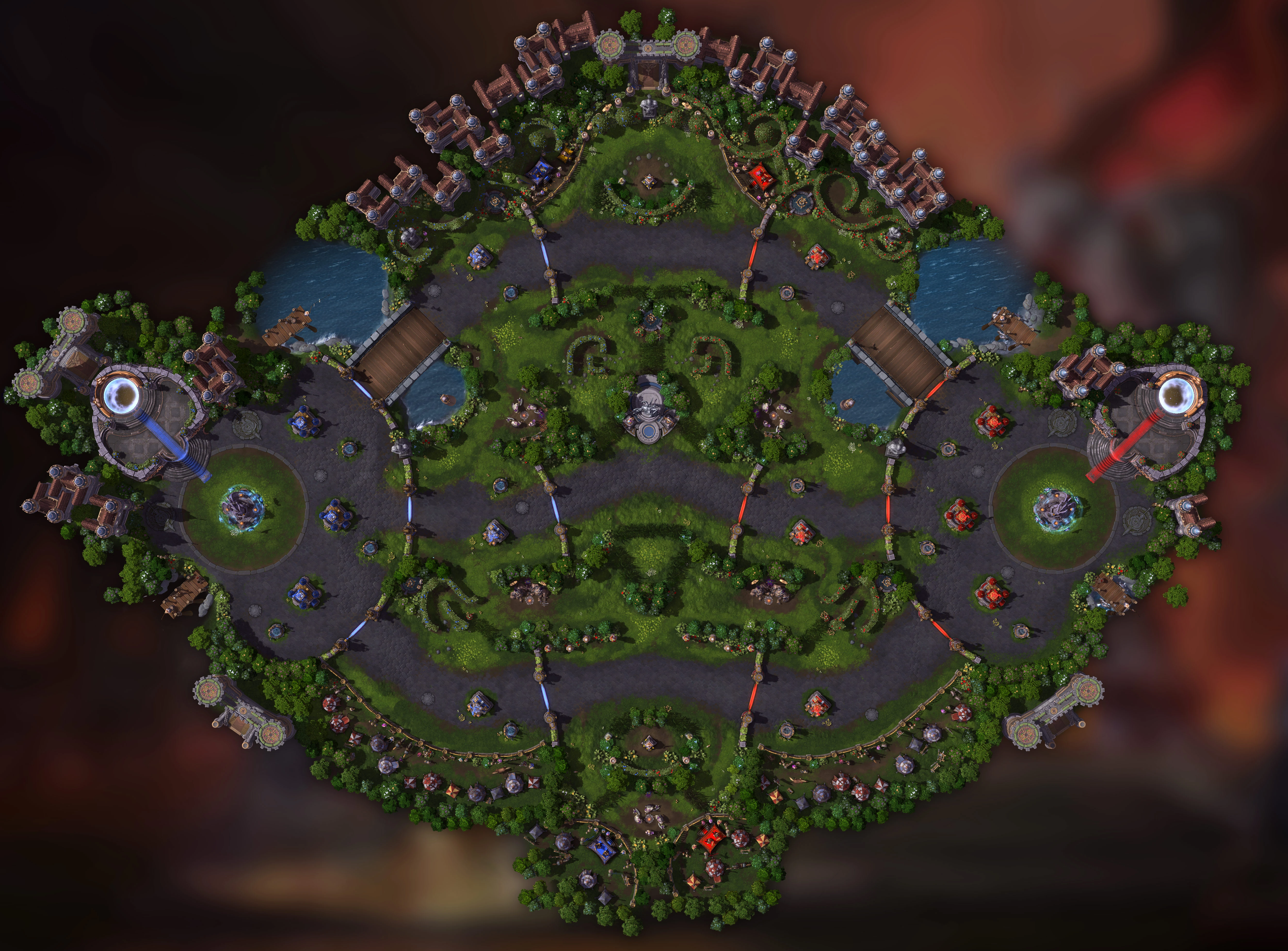 The "Dragon Shire" battleground has three lanes with all of the objectives located in a garden at the center of the map and above and below the center of the outer lanes.